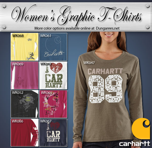 Carhartt is for women too; Dungarees.net has the best selection of Carhartt women’s limited edition graphic t-shirts. Visit us online to find your size and favorite color.