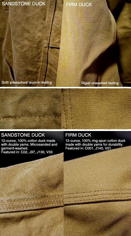 Both, Sandstone and Duck materials, are made of 12-ounce cotton. Both materials will keep you comfortable and protected during work or every day wear. So what is the difference?