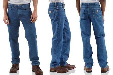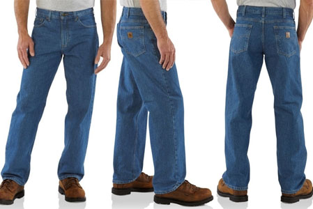 Carhartt B17 Denim Relaxed Fit Jeans: Cut for comfort on the job, Carhartt’s relaxed fit jean sits slightly below the waist and features a relaxed-fitting seat and thigh. Made of tough, 15-ounce 100% cotton denim, it features two reinforced back pockets and a 15.25-inch tapered leg opening.